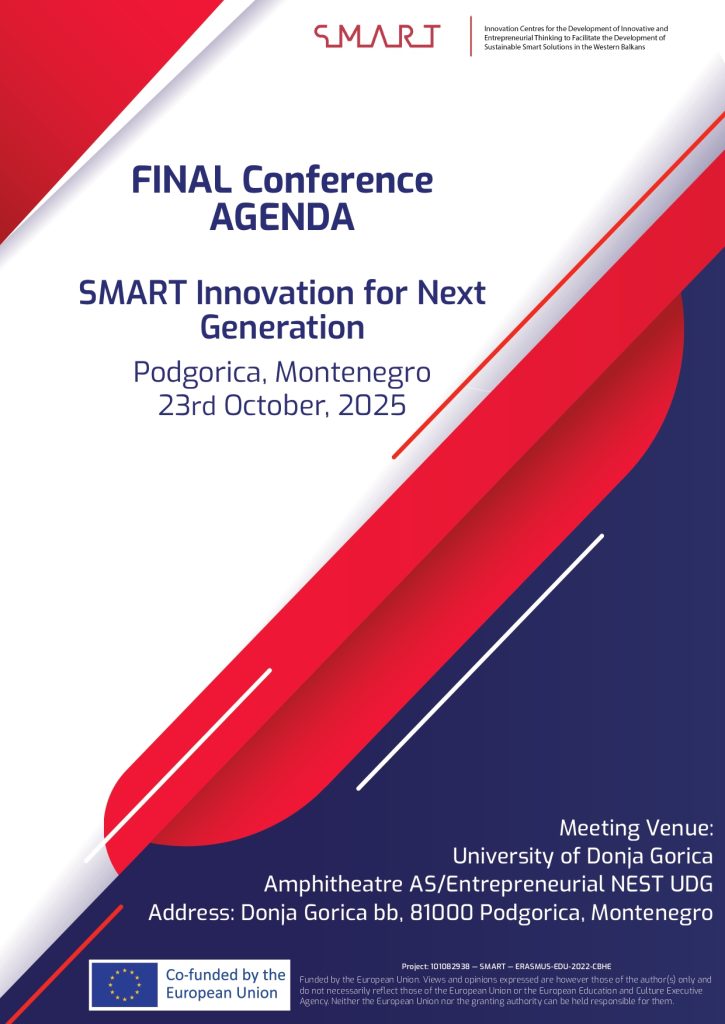 The Erasmus+ CBHE SMART project, an EU-funded initiative, supports the creation of Innovation Centres to strengthen innovation and entrepreneurial thinking across the Western Balkans. Its Final Conference – SMART Innovation for Next Generation will be held on 23 October 2025 at the University of Donja Gorica, Podgorica (Montenegro).